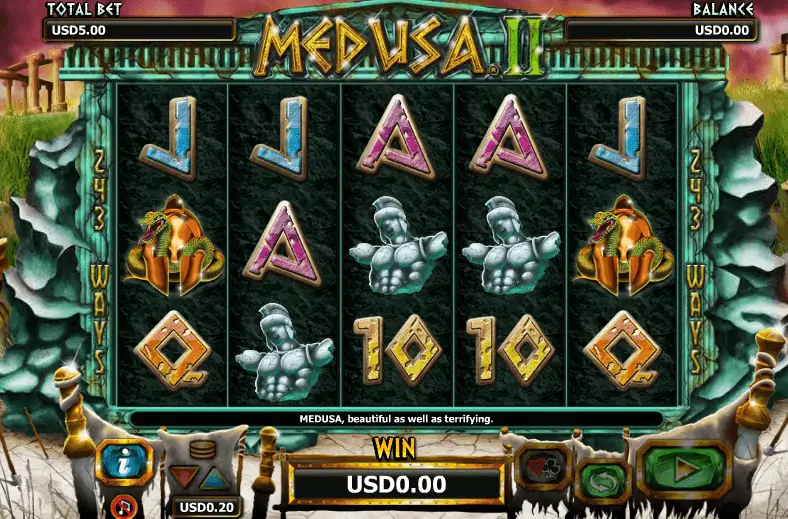 《美杜莎II》采用经典五轴三排设计,共设25条固定连线。各类图标围绕希腊神话展开,如:战士头盔、神庙、盾牌、黄金蛇戒、美杜莎头像等。