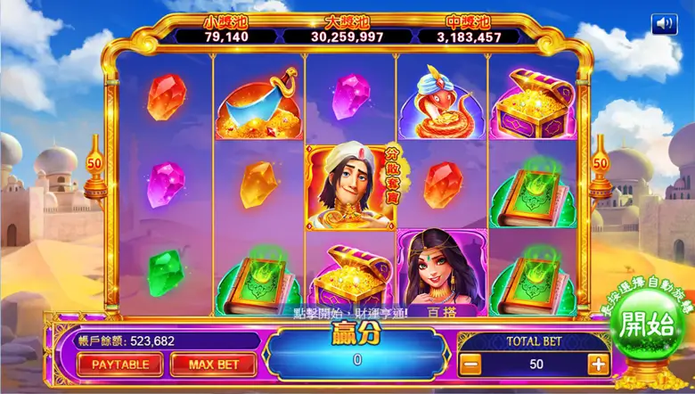 从整体视觉来看,阿拉丁神灯采用了较为浓郁的中东风格。背景多以夜幕下的沙漠王城、穹顶宫殿与星空为主,色彩搭配以金色、深蓝与宝石色调为核心,呈现出华丽而不浮夸的观感。